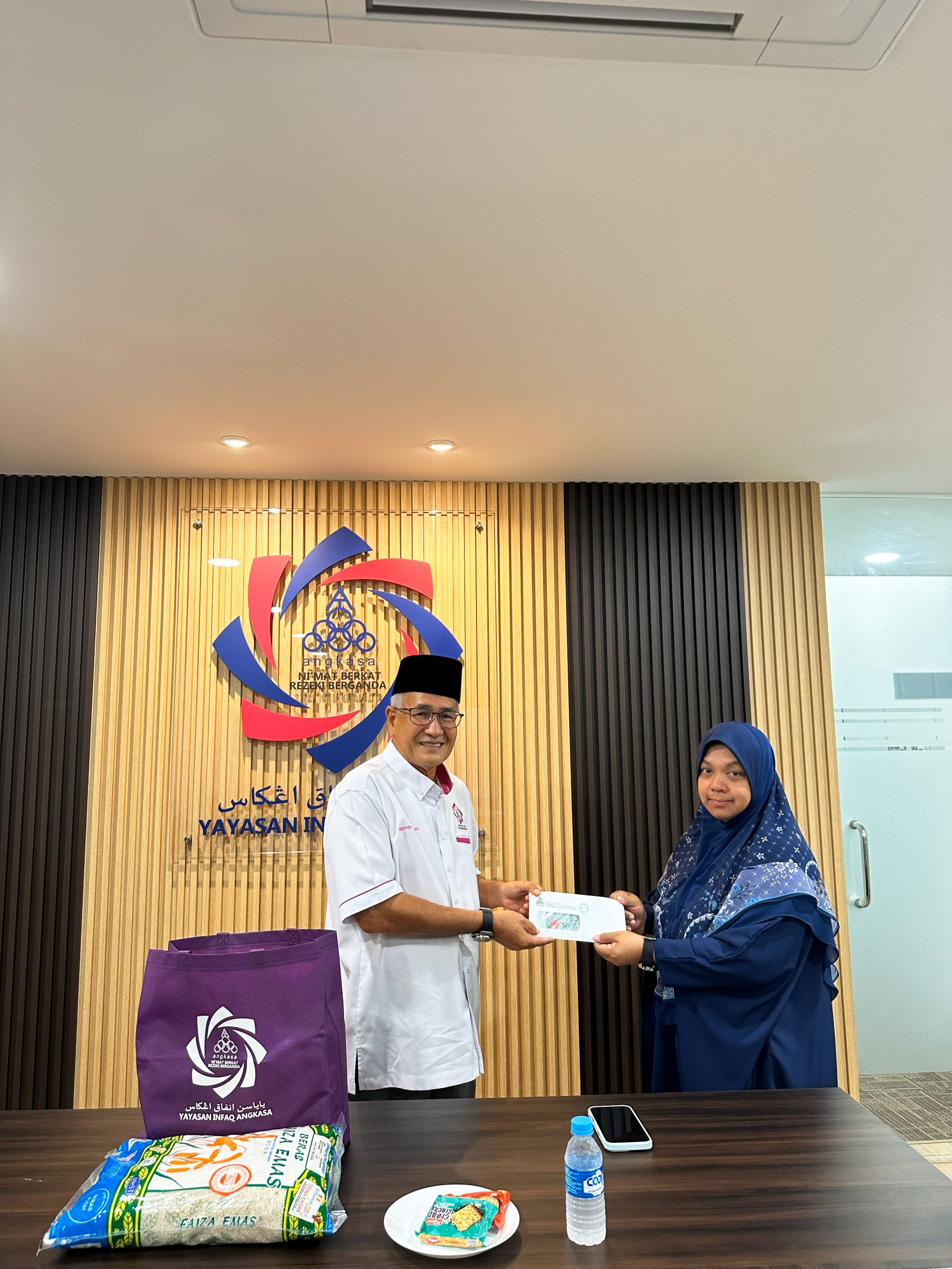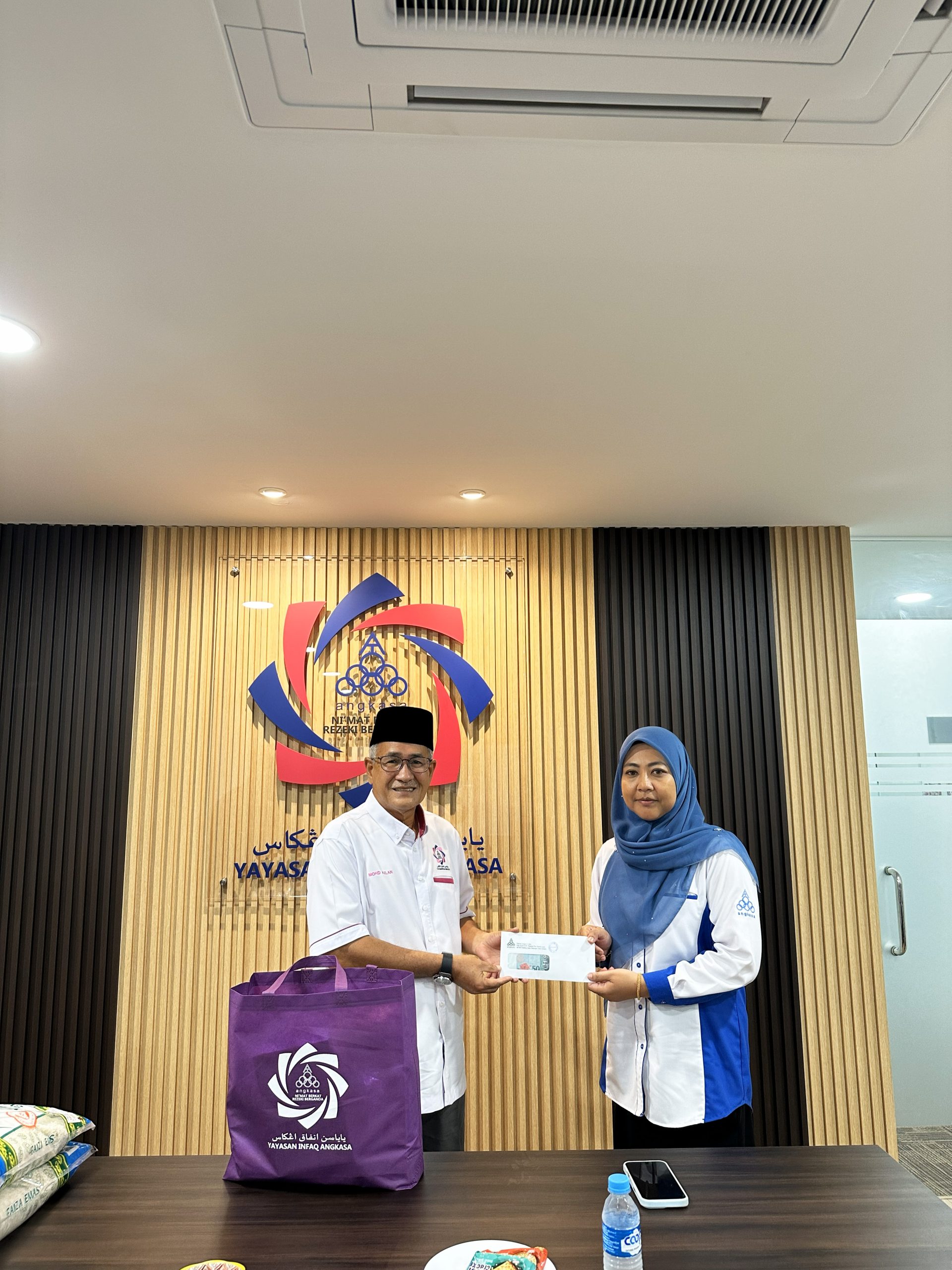 Majlis penyerahan sumbangan telah disempurnakan oleh YBrs. Dr. Mohd Azlan Yahya, Ketua Pegawai Eksekutif Yayasan Infaq ANGKASA, bertempat di Pejabat Urusan Yayasan Infaq ANGKASA.
